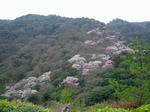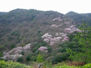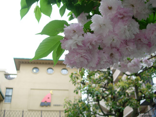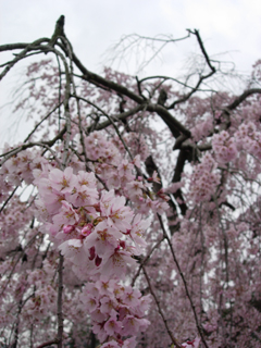 散り行く枝垂桜と満開の染井吉野、と三門。